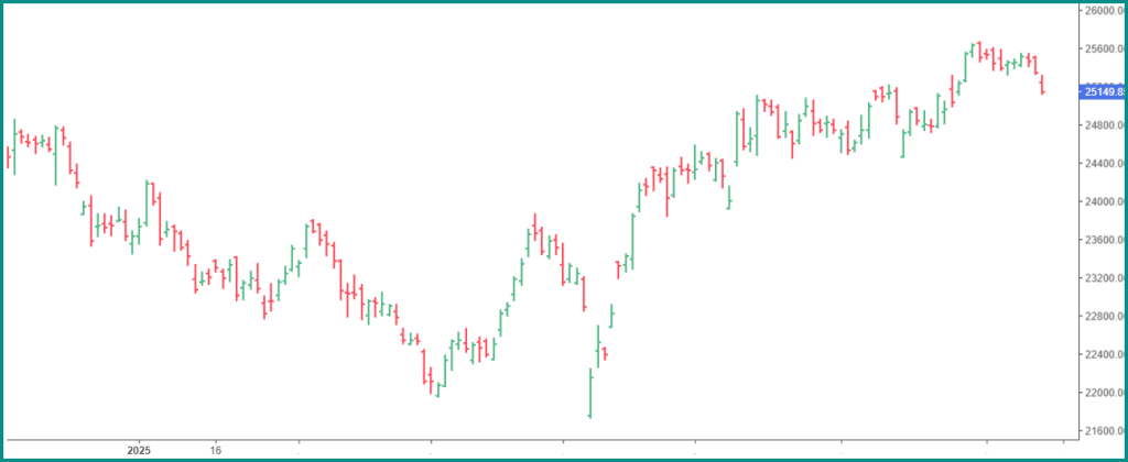 According to Nifty charts, Nifty index Closed today at 25,149 the key support level for Nifty is placed at 25,070,25,010 followed by 24,960 if the index moves up, key resistance levels to watch out for are 25,190,25,250 and 25,320.