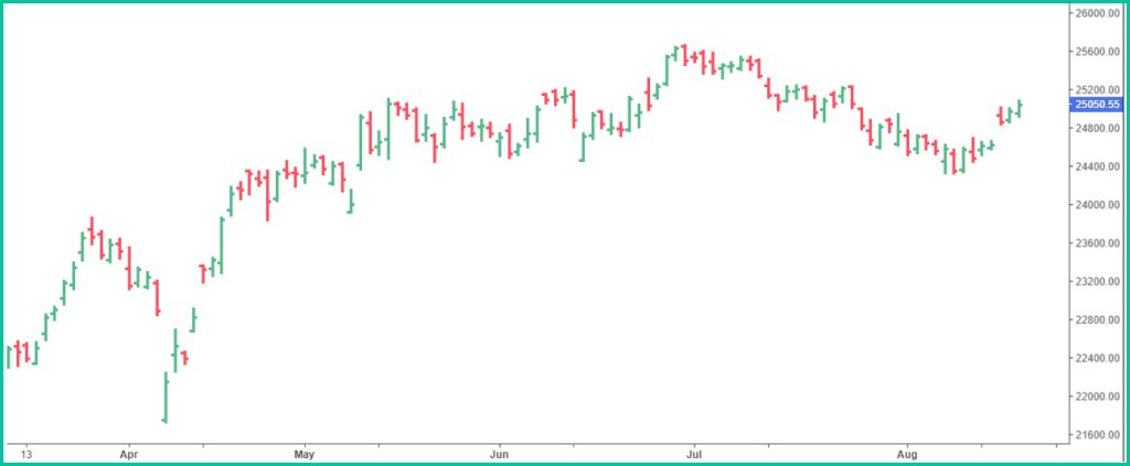 According to Nifty charts, Nifty index Closed today at 25,050 the key support level for Nifty is placed at 24,980,24,920 followed by 24,870 if the index moves up, key resistance levels to watch out for are 25,110,25,170 and 25,200.